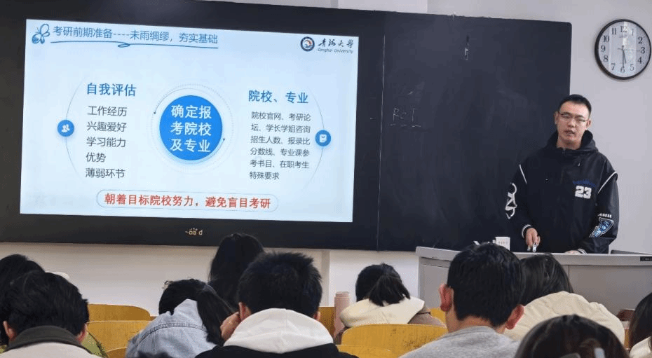 同为研二的程禹荣则带来系统备考指导。院校选择上,她建议从城市发展、公司类型、个人志向综合考量,指导同学们利用院校官网、研招网等渠道关注招生人数、报录比等关键信息,同时客观评估实力选校。科目备考方面,她推荐肖秀荣、徐涛等政治资源并分阶段说明学习重点;英语备考强调单词基础,推荐唐迟阅读、刘晓燕翻译等;专业课则建议建知识框架、反复背诵并做真题,完成三轮系统复习。
