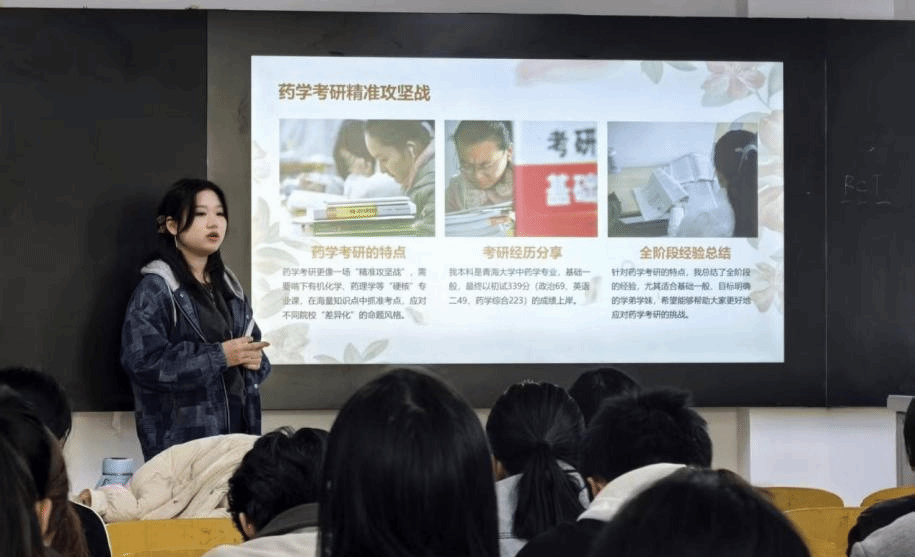 薛顺鑫师兄结合自身“二战”与职场经历分享。他坦诚首次考研因盲目跟风、缺乏规划失败,又以毕业后工作再离职的经历,强调高学历对职业发展的优势,建议考研需结合职业规划。备考策略上,作为在职备考过来人,他分享将每日4-6小时学习时间按10分钟分段利用的方法,以及针对中药学的“背-默写”循环记忆法;心态调整上,他分享用散步调节情绪的经验,鼓励大家正视备考的意志磨练价值。